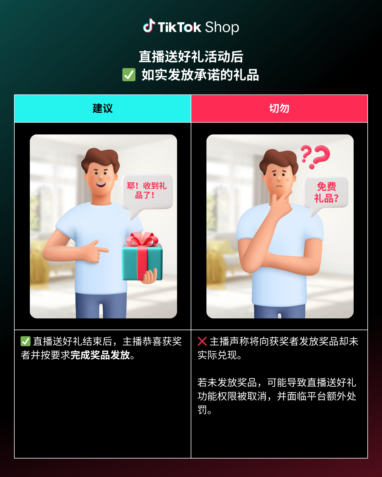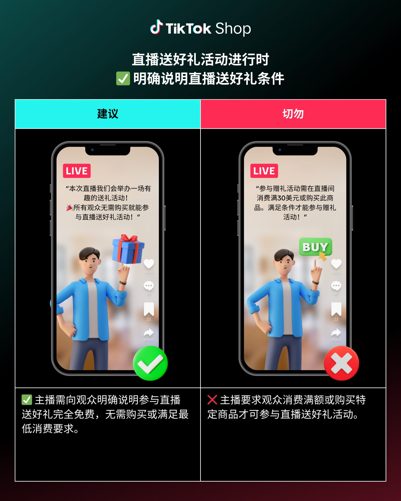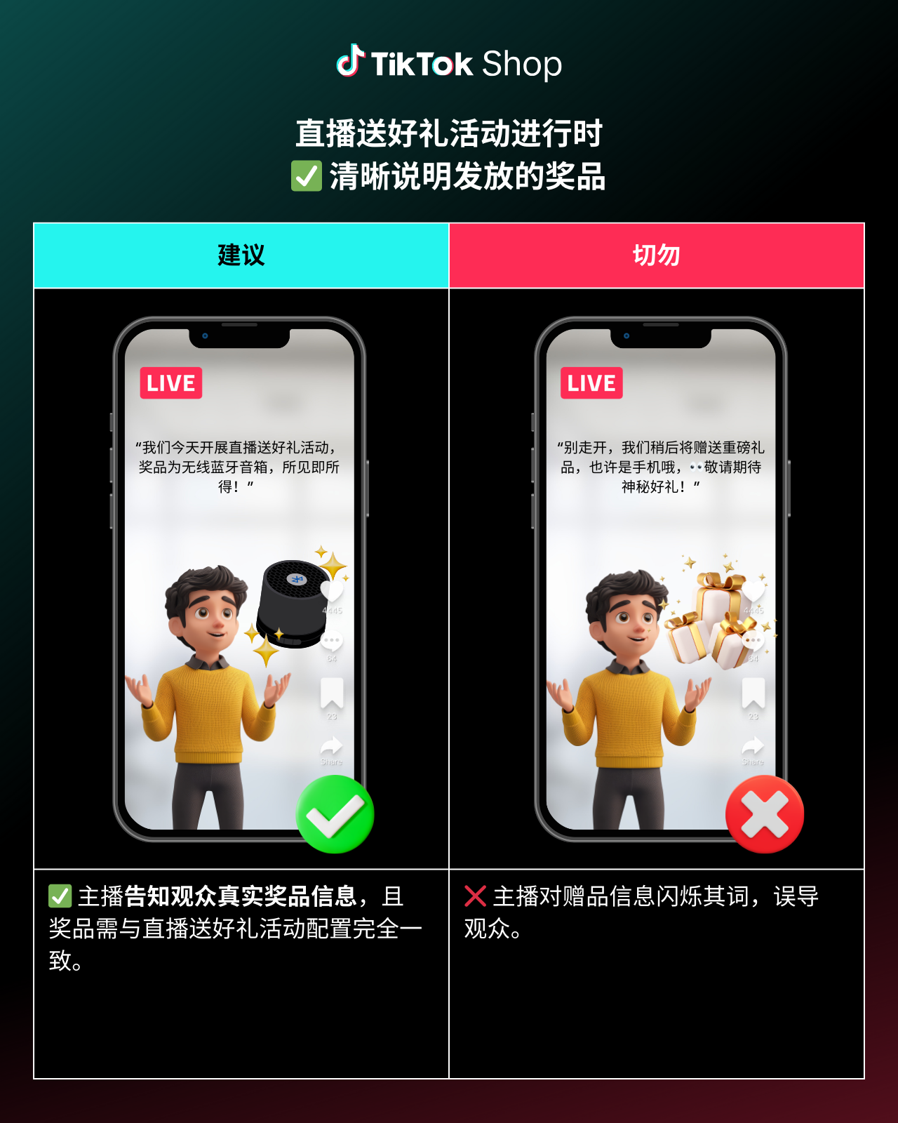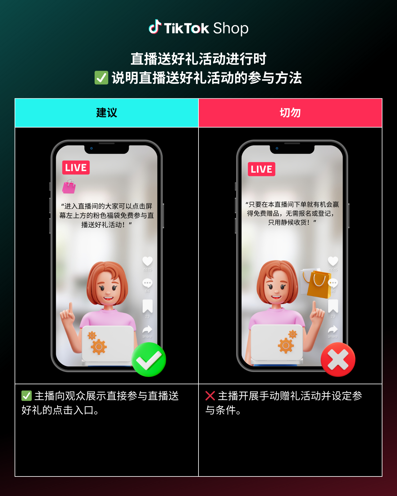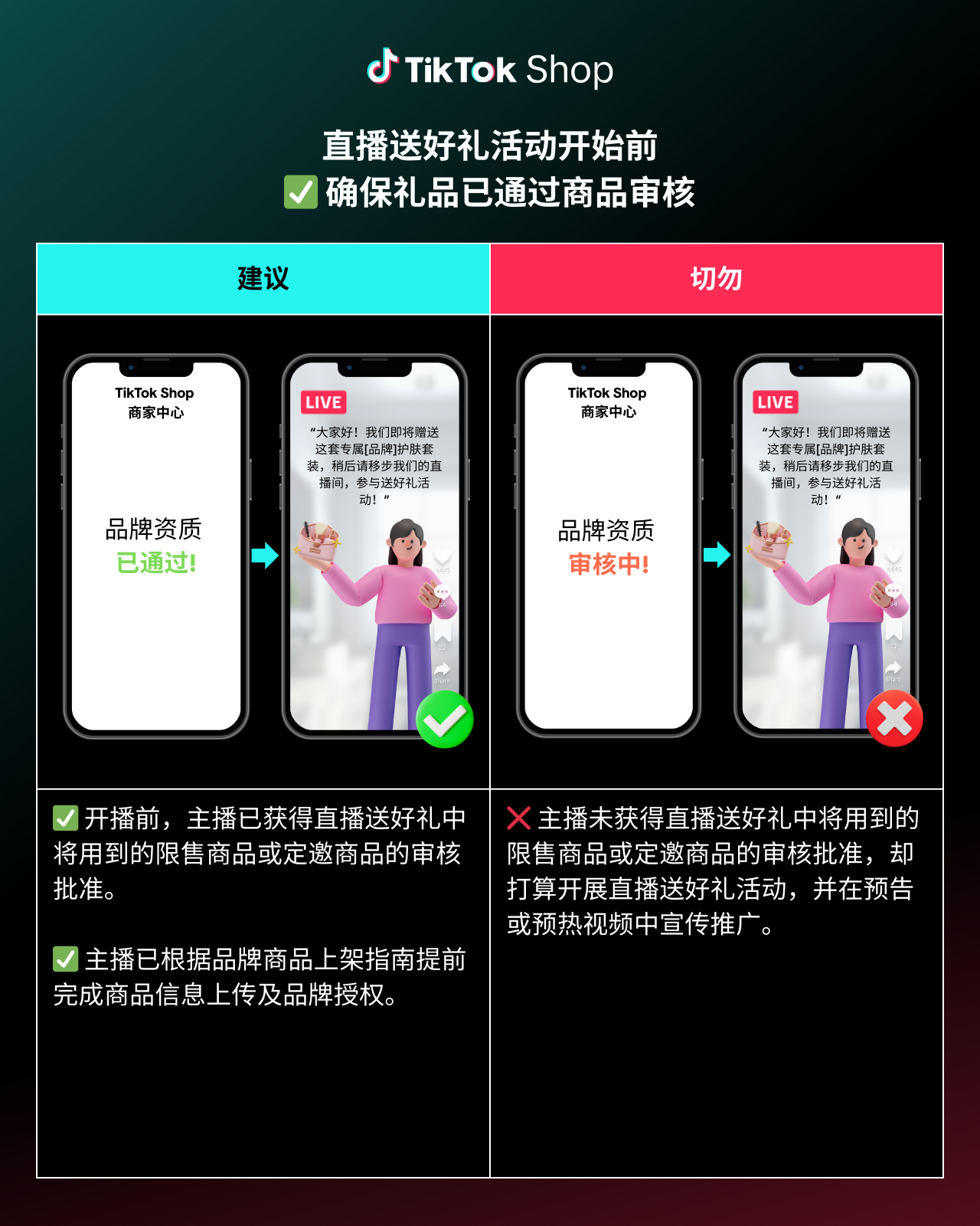 为确保直播顺利进行,为您和观众营造良好体验,请参阅以下“直播送好礼”最佳做法及规避事项。注意,始终遵守TikTok Shop规则,避免潜在违规风险至关重要: